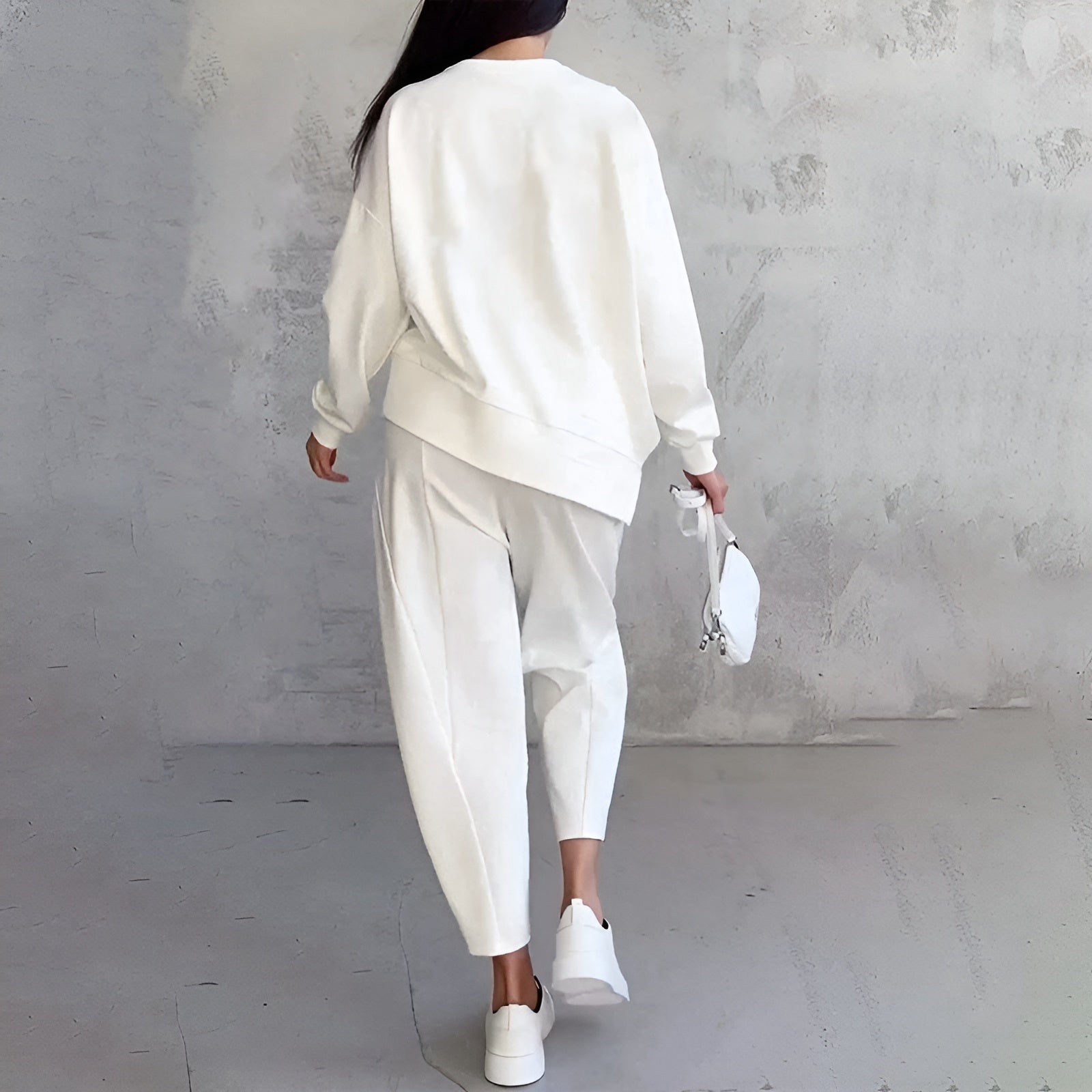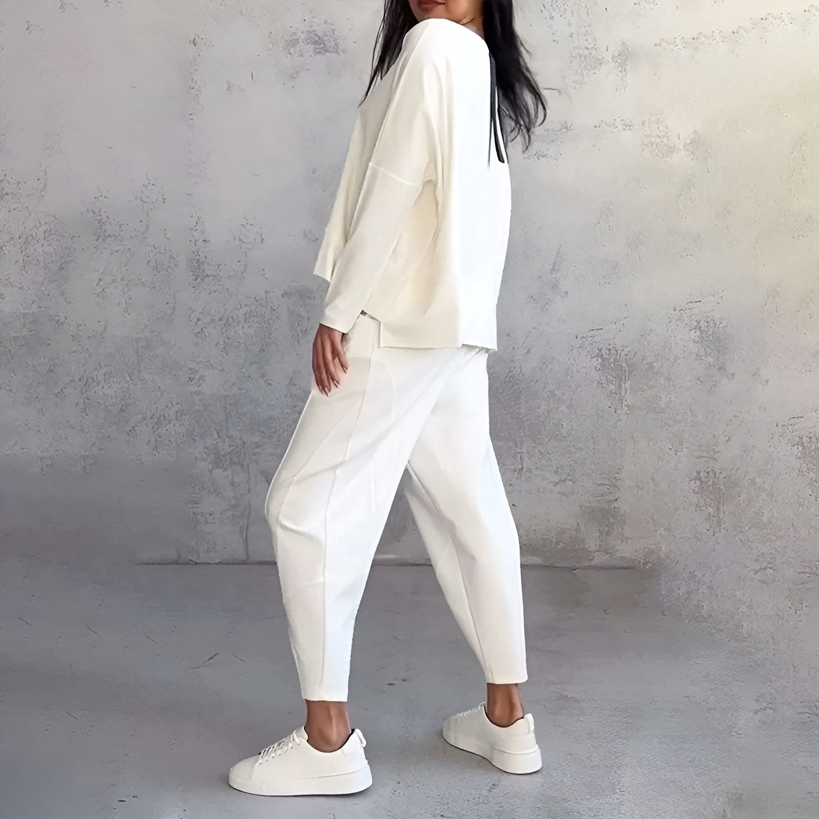 Disa™ Stilren Set ger dig minimalistisk skönhet, många stylingmöjligheter och komfort i ett komplett set. Den tvådelade outfiten består av en löst sittande topp med långa ärmar och en högmidjad byxa med avsmalnande ben, båda i en elegant elfenbensvit nyans. Perfekt för dig som uppskattar enkel, modern och klassisk stil.